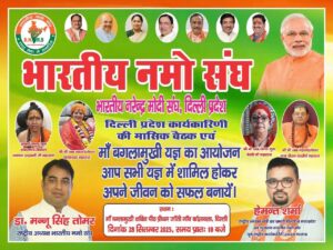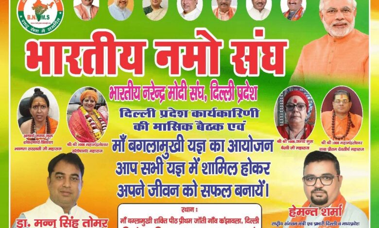 भारतीय नमो संघ दिल्ली प्रदेश की तरफ से हवन का आयोजन एवं दिल्ली प्रदेश की कार्यकारिणी का पुनः गठन किया जायेगा और इस बैठक मे इनके आशीर्वाद से पीथाधीश्वर गायत्री त्रिवेणी प्रयाग पीठ महंत अखाडा परी प्रमुख शकराचार्य त्रिकाल भवंता सरस्वती जी महाराज की उपस्थित रहेगी इसीलिए सभी से निवेदन है समय से पहुंच कर हवन मे शामिल हो उसके बाद सभी साथी नाश्ता एवं भोजन करें फिर इसके पश्चात दिल्ली प्रदेश की कार्यकारिणी का पुनः गठन किया जायेगा।